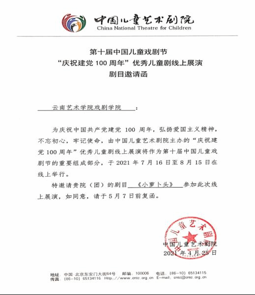 4月25日,音乐剧《小萝卜头》入选第十届中国儿童戏剧节“庆祝建党100周年”优秀儿童剧线上展演。将于7月16日至8月15日,面向全国进行线上展演。
